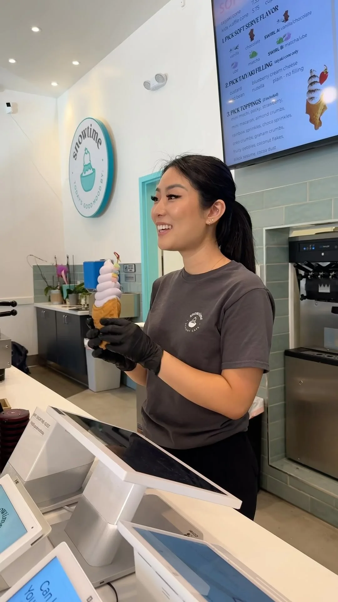 Soft serve made in-house served in a mochi waffle cone with fillings and beautiful toppings